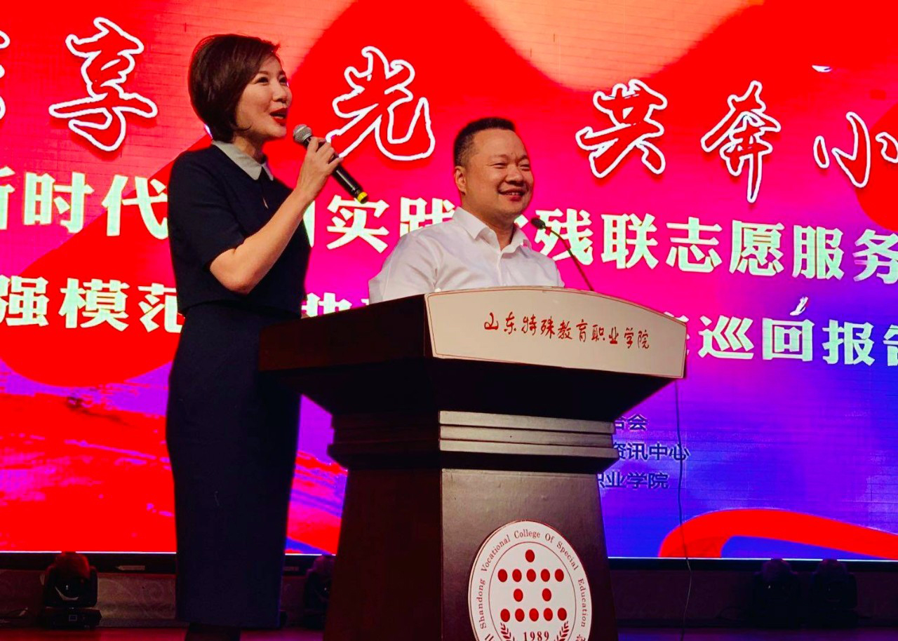 10月25日,新时代文明实践省残联志愿服务队——自强模范与助残先进事迹宣讲活动走进山东特殊教育职业学院,山东省残联副理事长、党组成员张文涛,省残联宣文部部长张学坤,山东特殊教育职业学院党委书记管洪锋、院长李心沁等领导出席活动。“全国自强模范”、我集团党支部书记王勇博士参加活动,并就个人求学创业的先进事迹进行现场宣讲。