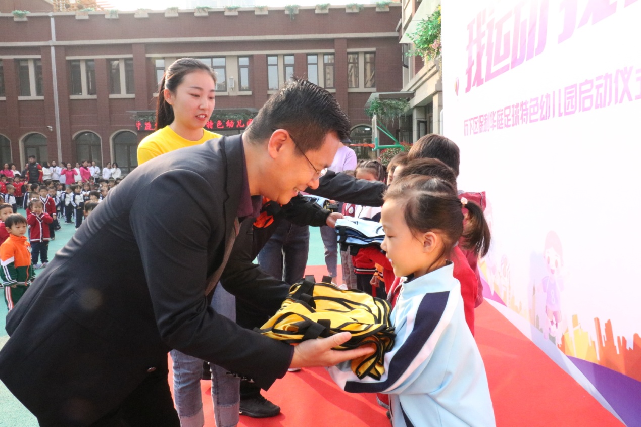仪式过程中,我集团总经理李校伟为小球员们赠送足球及训练背心,他勉励小球员们,开心踢球,快乐成长,尽情体验足球运动给大家带来的乐趣。随后,幼教老师及家长分别表演了“足球操”等精彩节目。