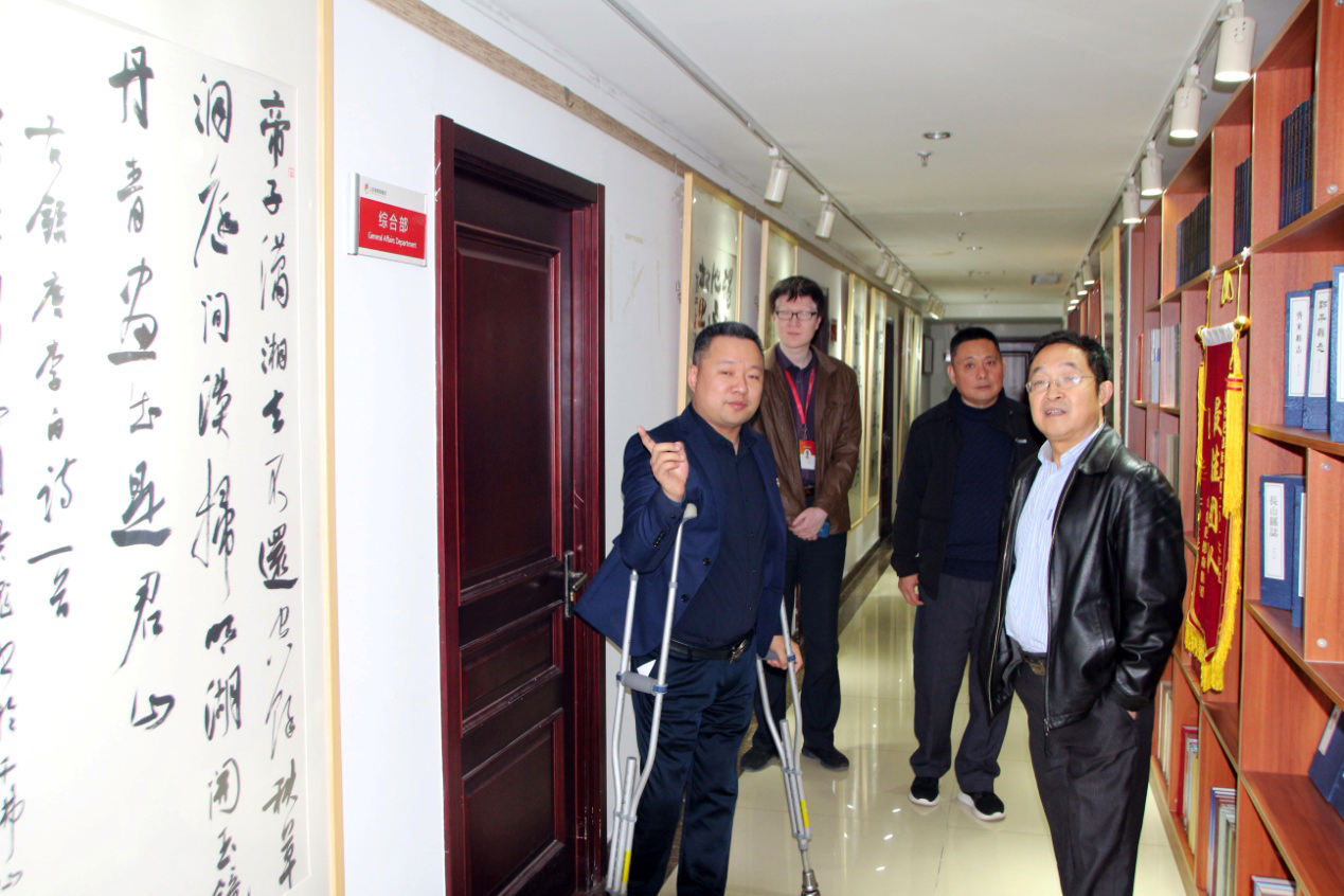 在王勇博士的带领下,程强处长一行依次参观了集团党建活动室、残疾人文化长廊、“艺盟苑”公益书画培训教室、以及集团大医学事业部、史志事业部、“博览医书”大数据平台项目等各业务职能部门办公区域。