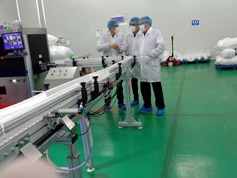 在王昌旺的带领下,李静一行对厂房设备、设施进行了参观,对净化车间内的生产线进行了审计。参观过程中,领导们对我公司的智能视觉检测设备以及自动化生产线给予高度评价,对车间现场的管理及质量控制给予充分肯定。